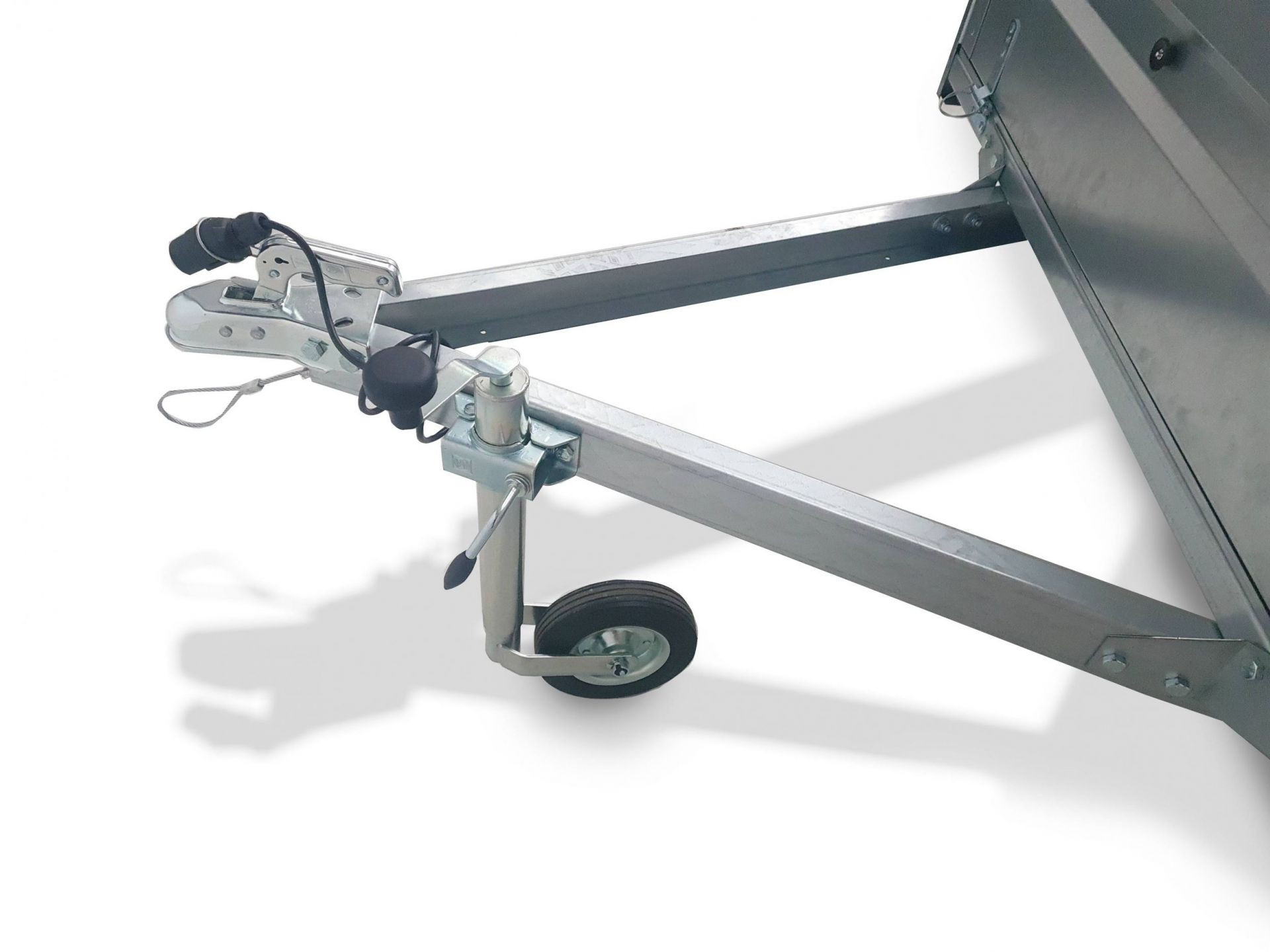 The trailer is made of durable sheet metal with a zinc coating thickness of 275 g/m2 (class A). This material is characterized by very good corrosion and oxidation resistance, combines good appearance with the strength of steel. The trailer structure is riveted and screwed, which significantly facilitates the replacement of elements damaged during use. The trailer suspension is a torsion axle with compact bearings (double-row angular contact ball bearing). Designed for long mileage, sealed and lubricated, they do not require any adjustment or maintenance. Double sealing protects against dirt and water getting inside the bearing.